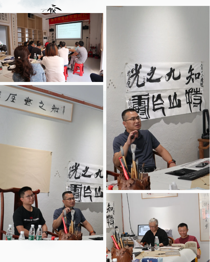 随后的练习环节,肖会长向大家示范执笔姿势、蘸墨舔笔和发力方式,围绕汉字“一”和“丨”等入门基础进行教学。大家认真倾听,学习领悟讲授要点和专业示范后,纷纷拿出笔、铺开纸张、蘸好笔墨,开始进行现场练习,静心感受笔墨书香和国学之美。